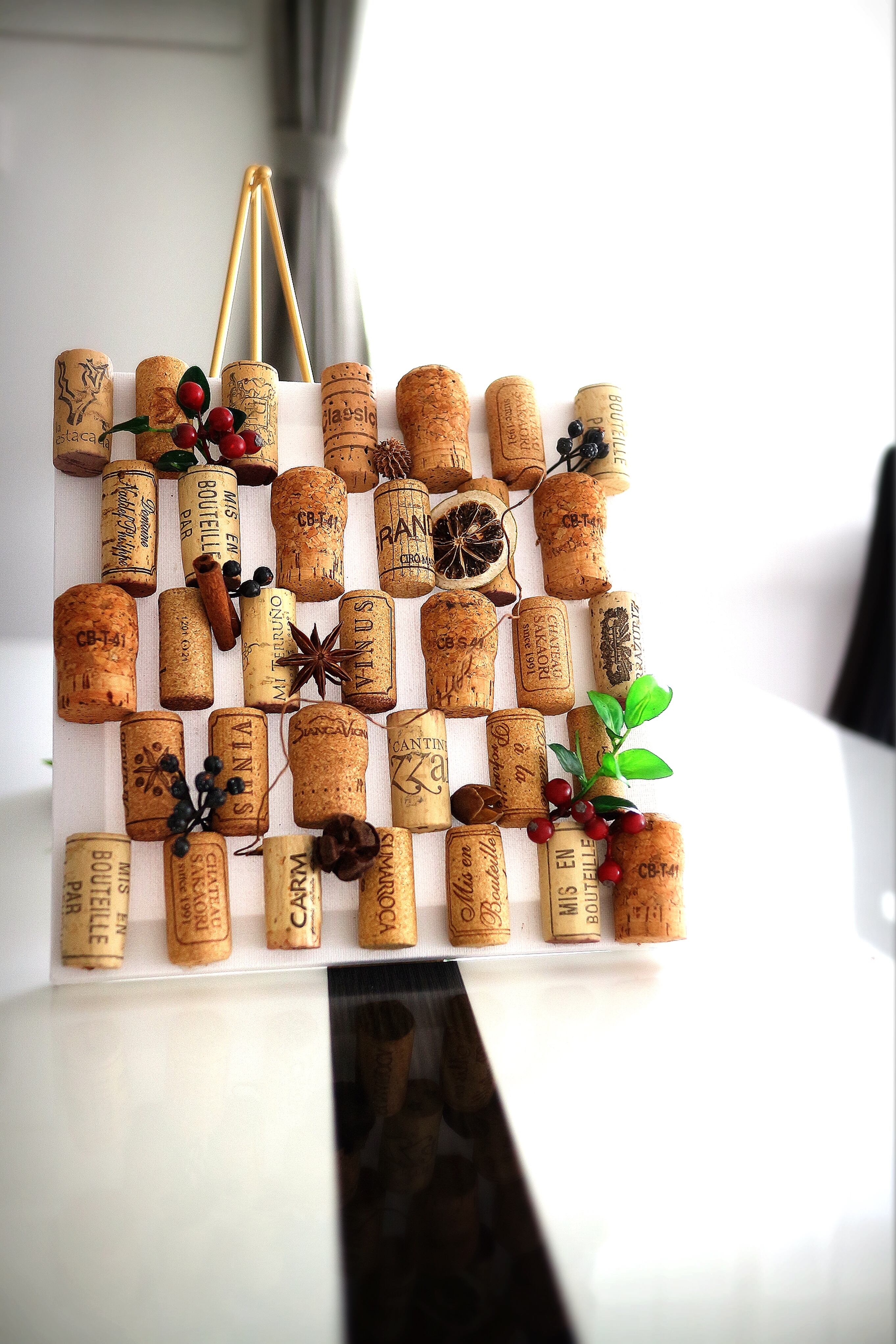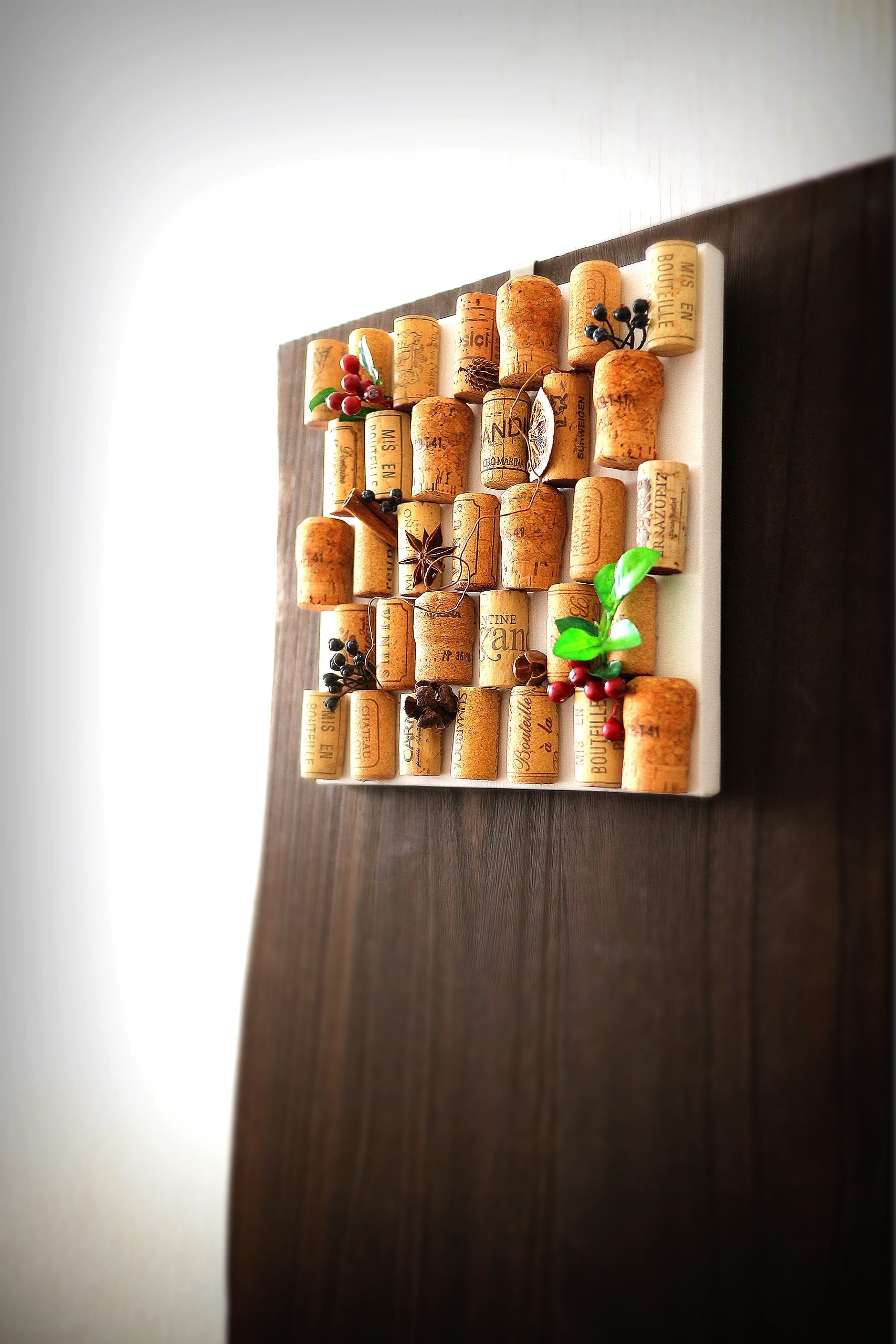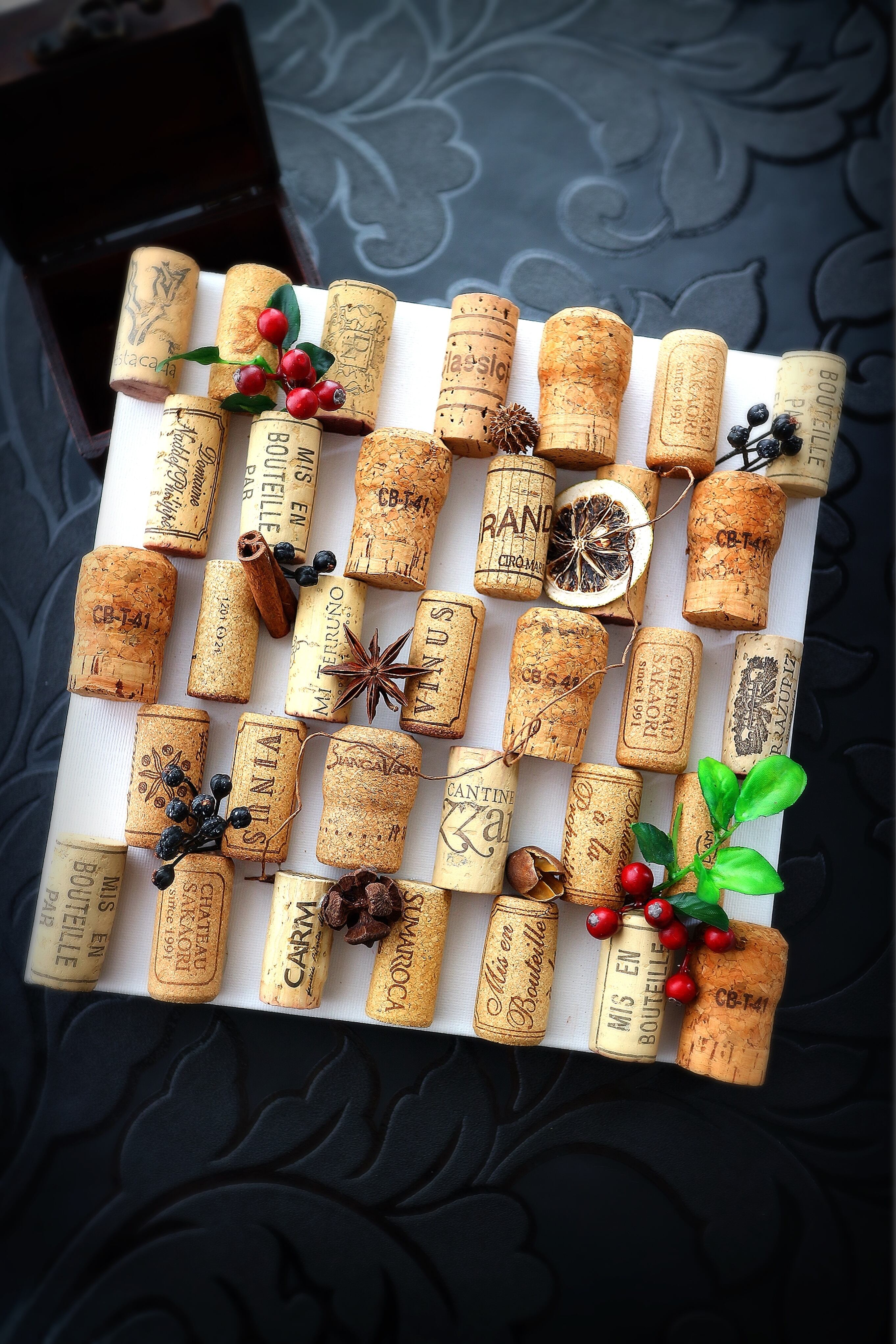 キャンバスボードにシャンパン・ワインコルクをセットした手作りの土台に