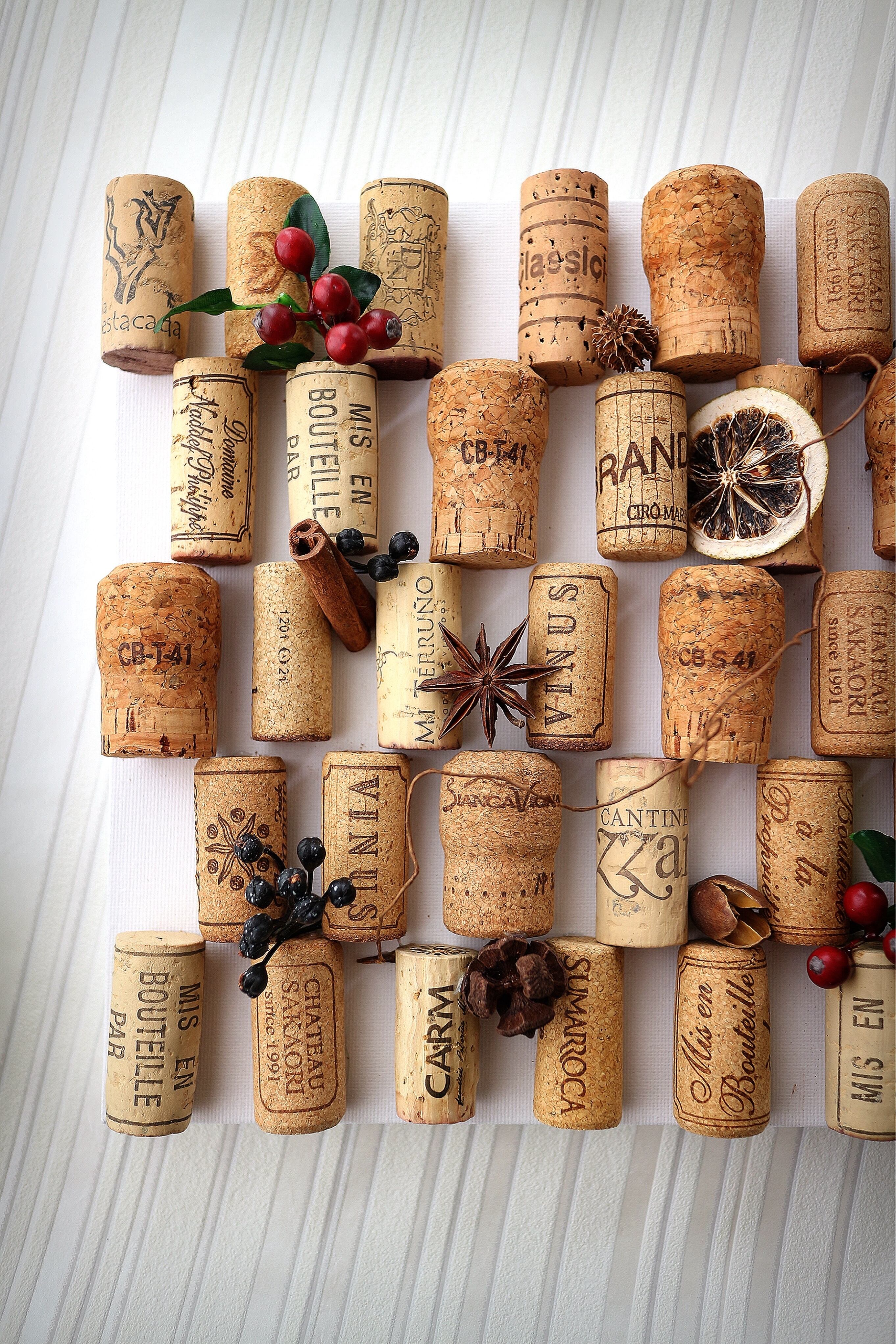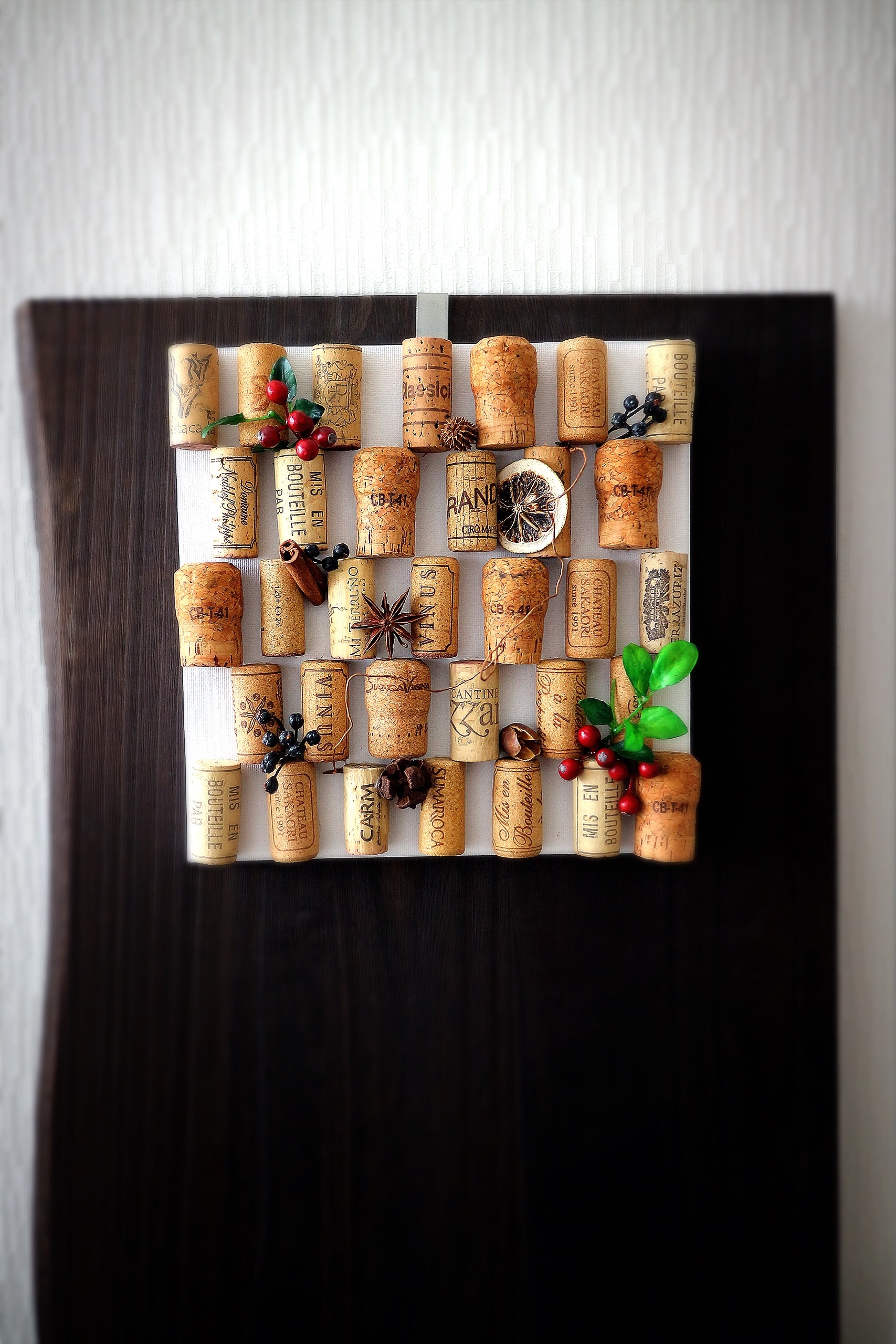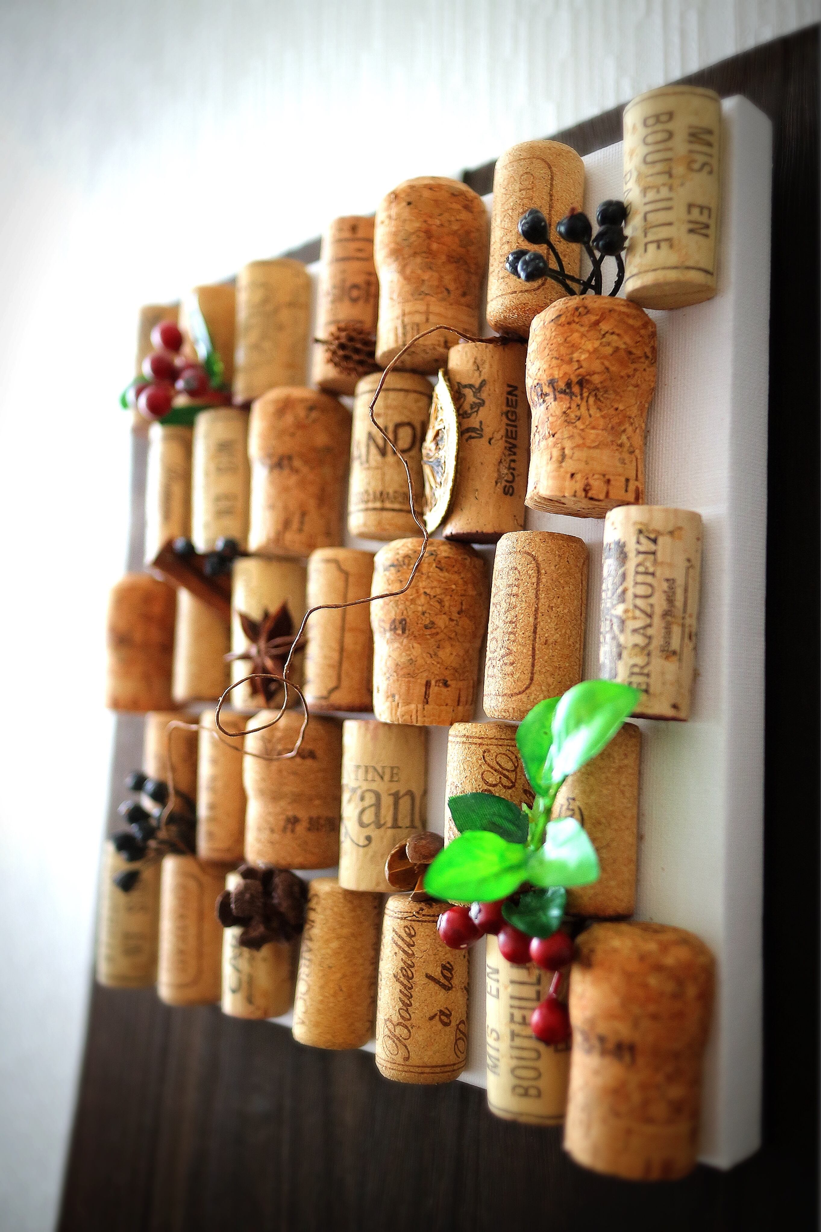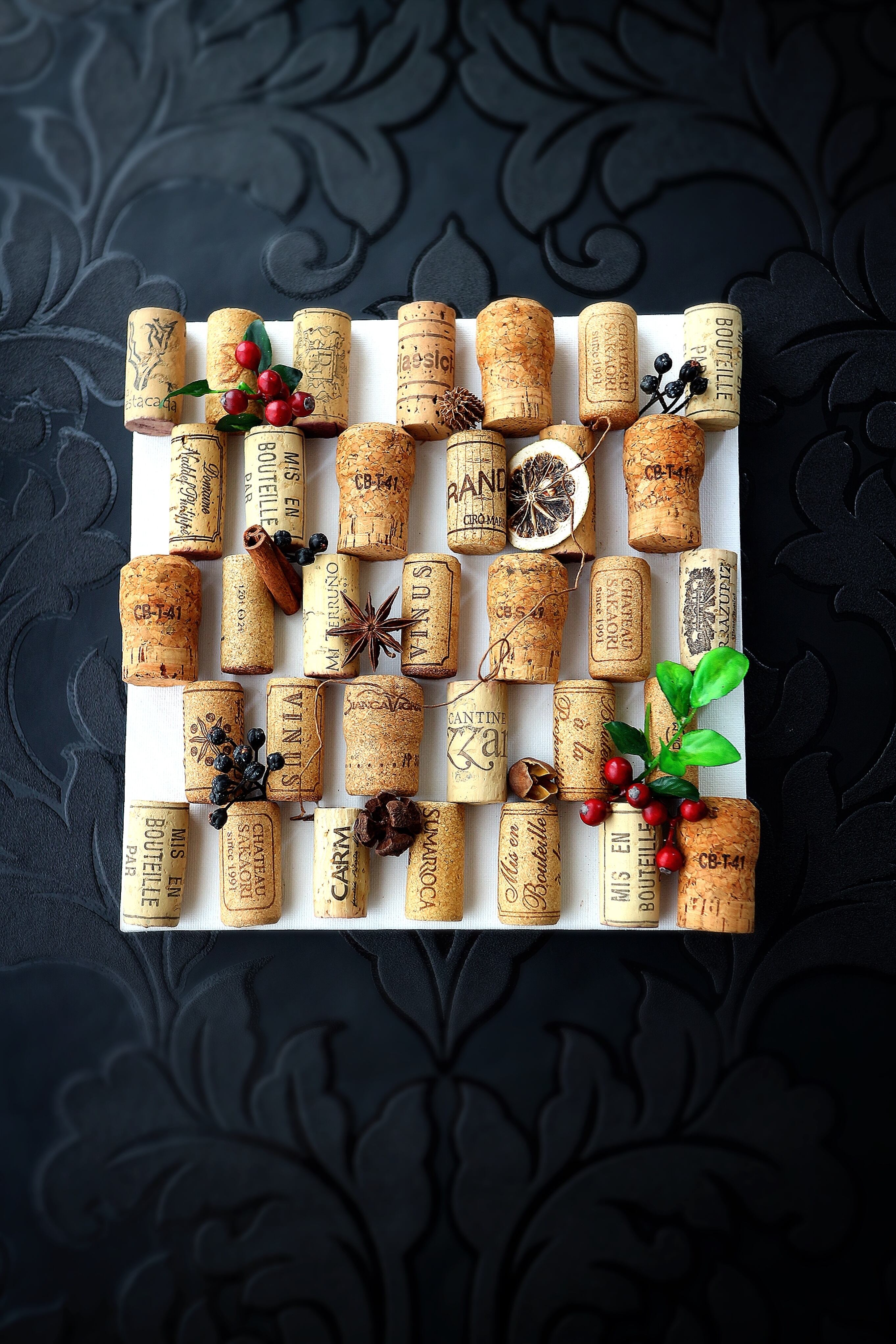 キャンバスボードにシャンパン・ワインコルクをセットした手作りの土台に